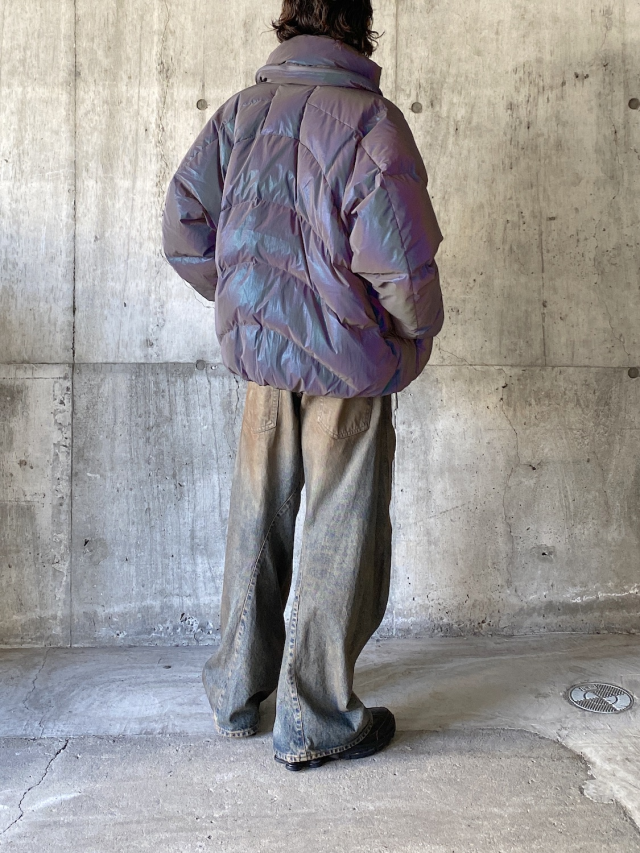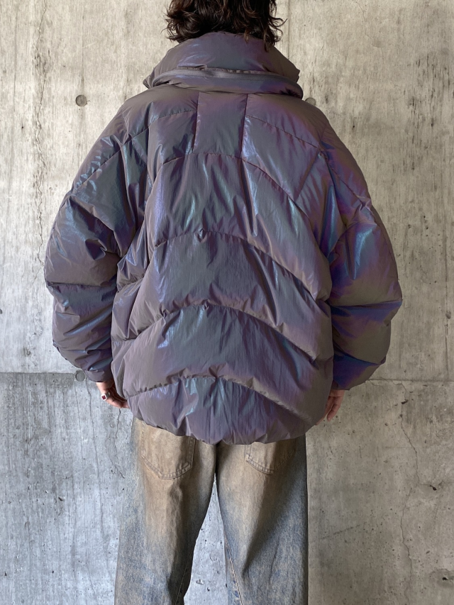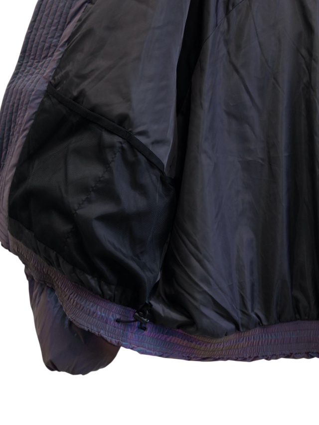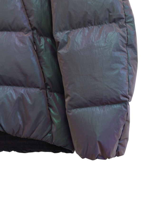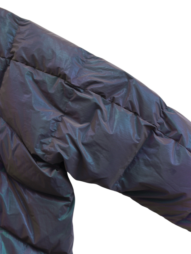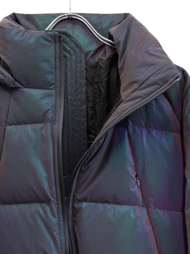 ステッチデザインによるカーブと首に付けられた収納フードが特徴のダウンジャケット。ホログラフィック反射素材をコーティングしたナイロン素材を使用。フロントのハの字ジップポケットは上下で仕切られており、内側にはメッシュポケットを採用するなど大容量の収納システムとなっている。肩はラグランスリーブ仕様、裾口両サイドにドローコードを配することでシルエットを調整することも可能。