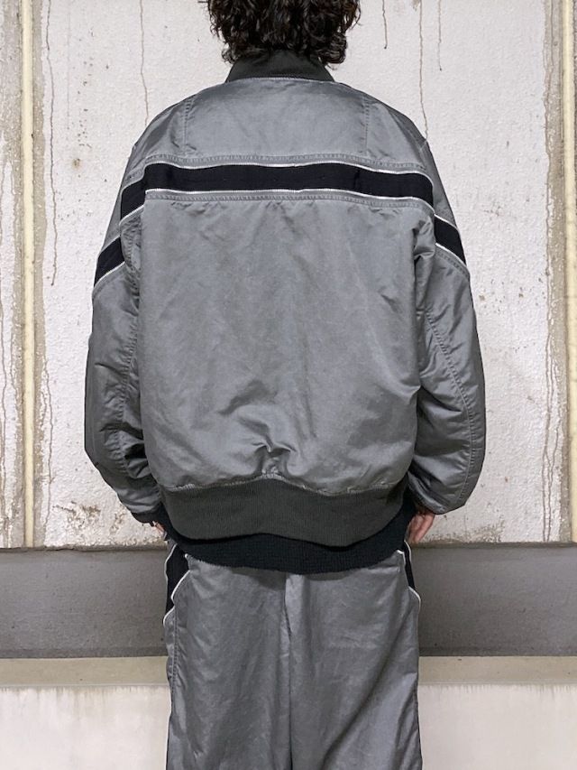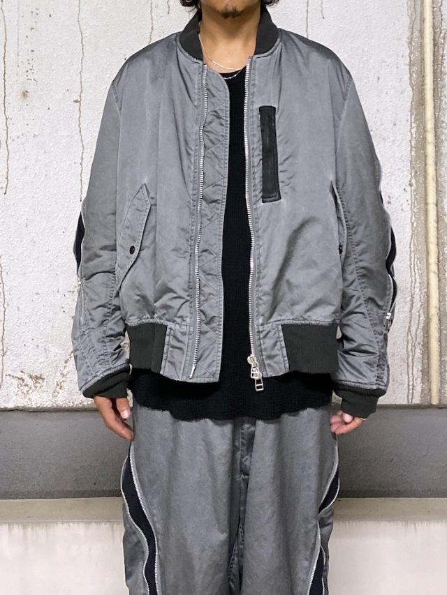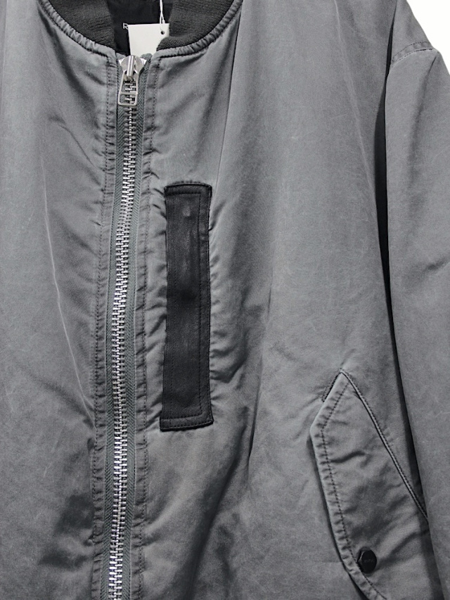 A flight jacket based on the MA-1 design. Nylon oxford fabric is pigment-printed and finished to achieve a stone like texture and puckering effect. The chest features a leather box tab reminiscent of early MA-1 jackets, with an internal zip pocket adding both design accent and practicality. The signature ROTOL detail-a zip running from the back to the sleeves-allows for silhouette customization. Ribbed cuffs and hem. Due to the post-production processing, slight damage and individual variations may occur.