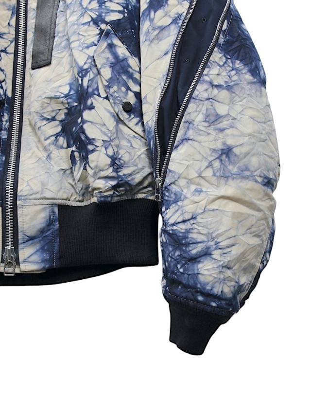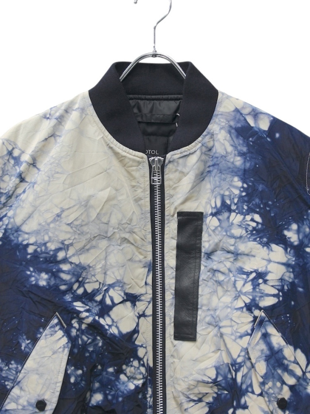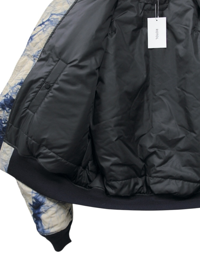 A MA-1inspired flight jacket crafted from nylon oxford fabric featuring a wrinkle finish and marble dyeing. The chest incorporates a leather box tab reminiscent of early MA-1 jackets, with an internal zip pocket adding both design accent and practicality. The signature ROTOL detail a zip running from the back to the sleeves allows for silhouette customization. Ribbed cuffs and hem. Due to the post production processing, slight damage and individual variations may occur.