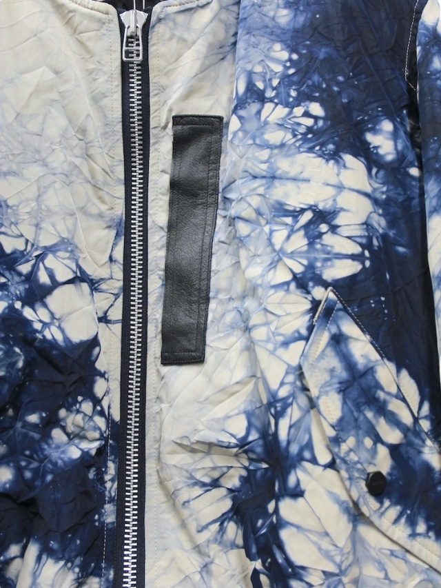 シワ加工とマーブル染めを施したナイロンオックス素材を使用したMA-1ベースのフライトブルゾン。胸部分に初期のMA-1に見られるレザーのボックスタブを採用、内側にジップポケットを配しデザインのアクセントと実用性をプラス。ROTOLを象徴するディテールとなる背面から袖にかけて施されたジップによりシルエットを変化させることが可能です。袖口、裾にはリブを採用。製品加工のため、ダメージや個体差がございます。