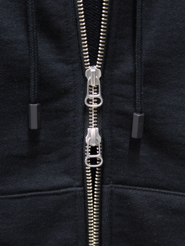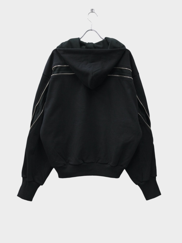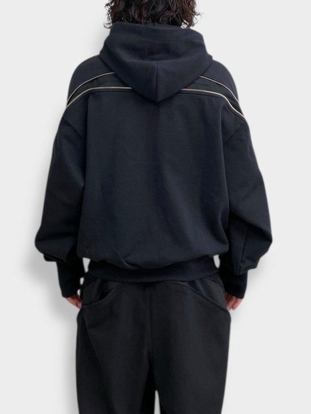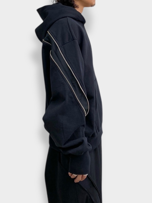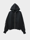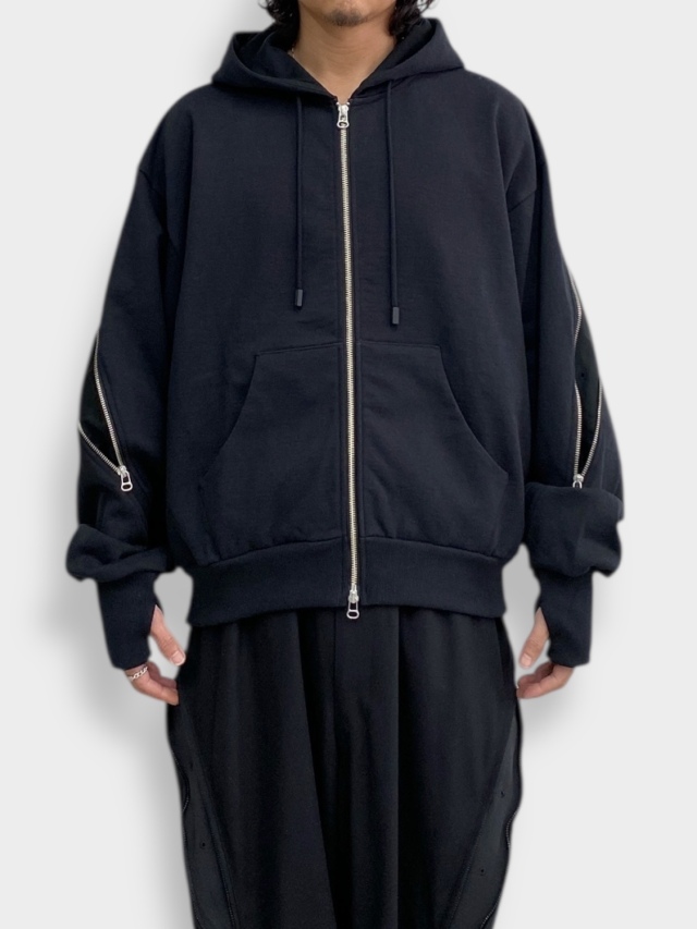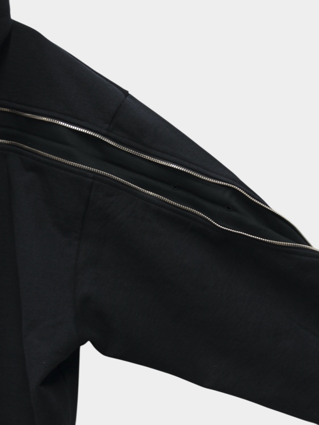 A full-zip hoodie featuring a bold zipper extending from the sleeve to the back. Crafted from a lightweight, crisp original fleece. Adjust the silhouette by opening or closing the back zipper. Designed with a relaxed body width and a compact length. Features ribbed cuffs with thumbholes. Made in Japan.