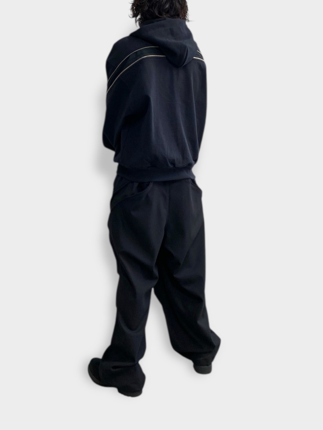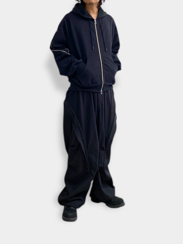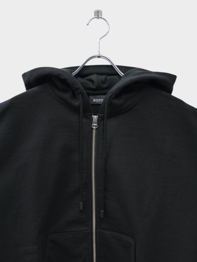 袖から背中まで繋がる大胆なジップが特徴的なフルジップパーカー。ハリ感のあるライトなオリジナル裏毛を使用、春、秋、冬と長いシーズン着用頂けます。背面ジップの開閉でシルエットに変化をつけられる。身幅にゆとりを持たせつつ、着丈はコンパクトに設計。袖口には指抜き付きのリブを採用。日本製。