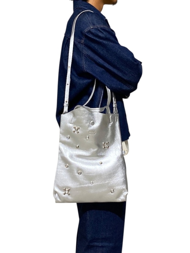 ミニマルなデザインに控えめながら主張するスタッズワークが目を惹くトートバッグ。付属のストラップにより天部内側、側面のDカンにてショルダーバッグとしてもご利用可能。軽量でしなやかな羊革を両面使用。内側には片側にジップポケット。日常使いのアイテムがちょうど収まるサイズ感で男女問わずオススメです。