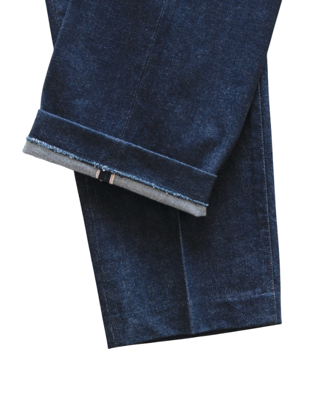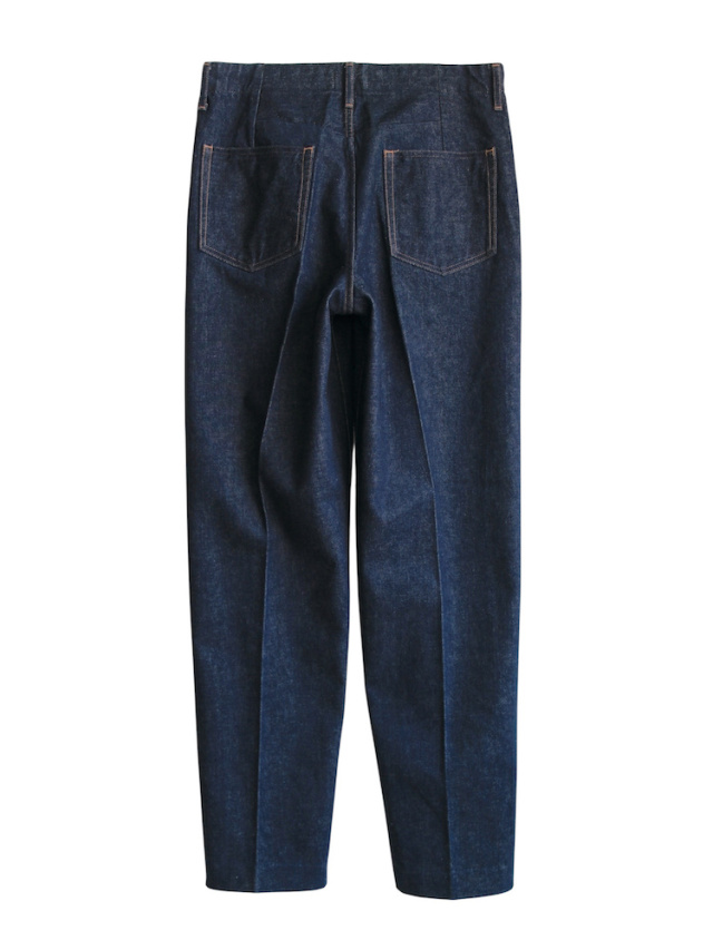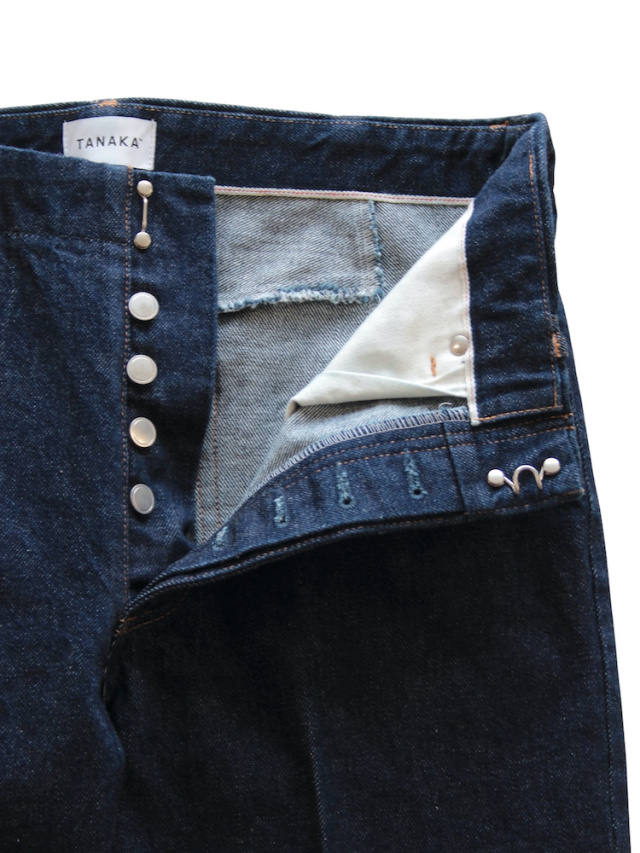 センタープレスが施された上品なテーパードシルエット、ミニマルを極めたTANAKAのベーシックモデル。サイドライン及び裾部分はステッチが表面に出ないスラックスディテールを踏襲。これにより裾上げを行った際も製品と同様の仕上がりとなり、雰囲気を損なわずに着用頂けます。また、タイパが声高に叫ばれる昨今敢えてのボタンフライも新鮮。ヴィンテージへの敬意を示しつつ、革新的なディテールを追求するTANAKAのコンセプトを体現する一本となっております。デニム生地には国内シェア50%を誇る広島県福山市のカイハラ製プレミアムセルビッジデニムを使用。丁寧に織られたこのデニムはサスティナブルなリサイクルコットンを使用。日本製。