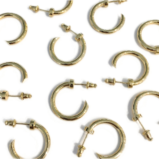 釘をモチーフにモダンなアレンジを加えたフープピアス。光沢感を出す為に限界まで磨きをかけ、スクエアなカッティングを施す事でパンクなモチーフを洗練されたクリーンなイメージに仕上げています。シンプルながら、存在感のあるサイズバランスにもこだわったユニセックスでオススメなデザイン。
